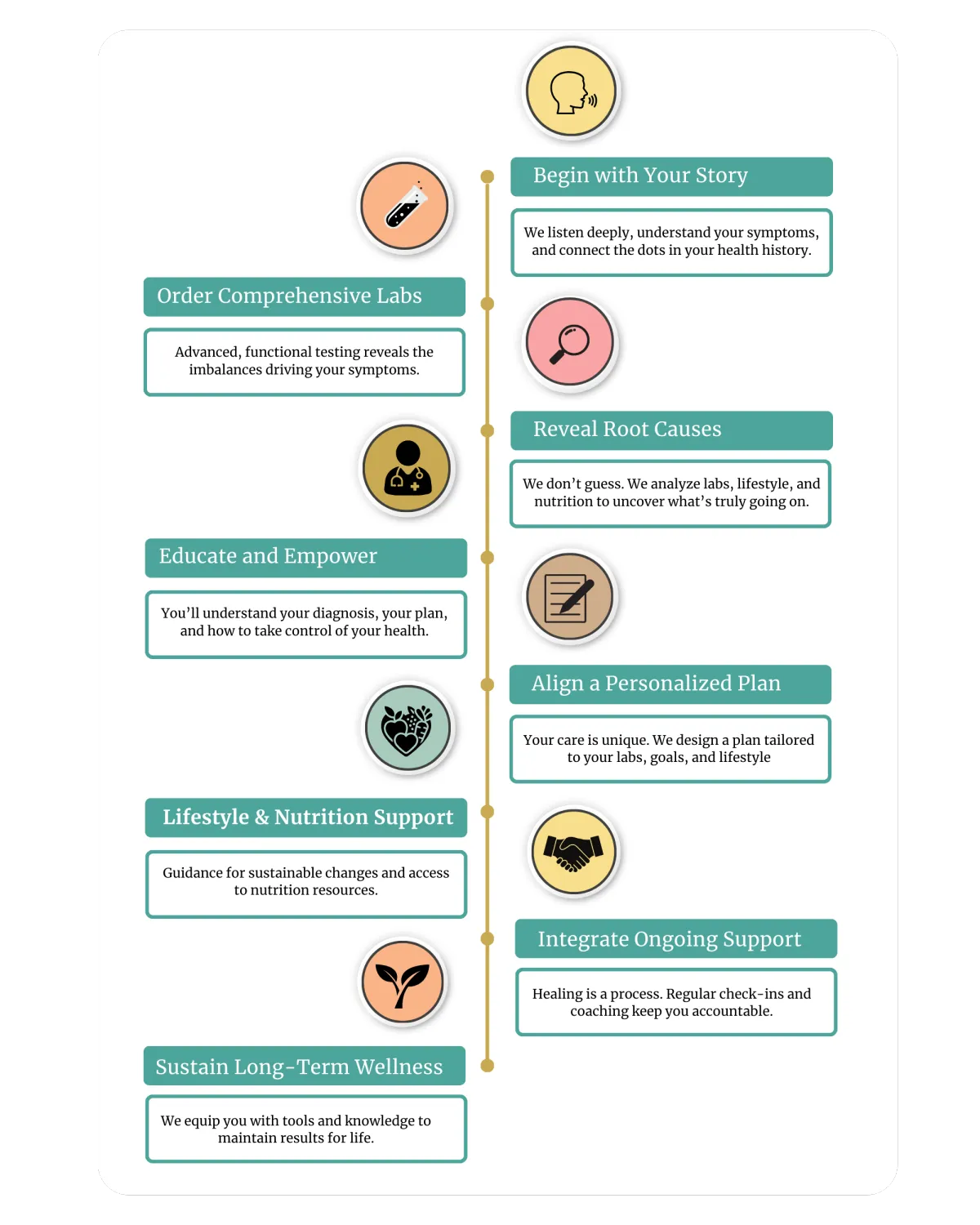 She takes time to truly understand your story, uses advanced lab testing to uncover the root of your symptoms, and partners with you on a personalized plan that includes nutrition, lifestyle, and evidence-based solutions.
